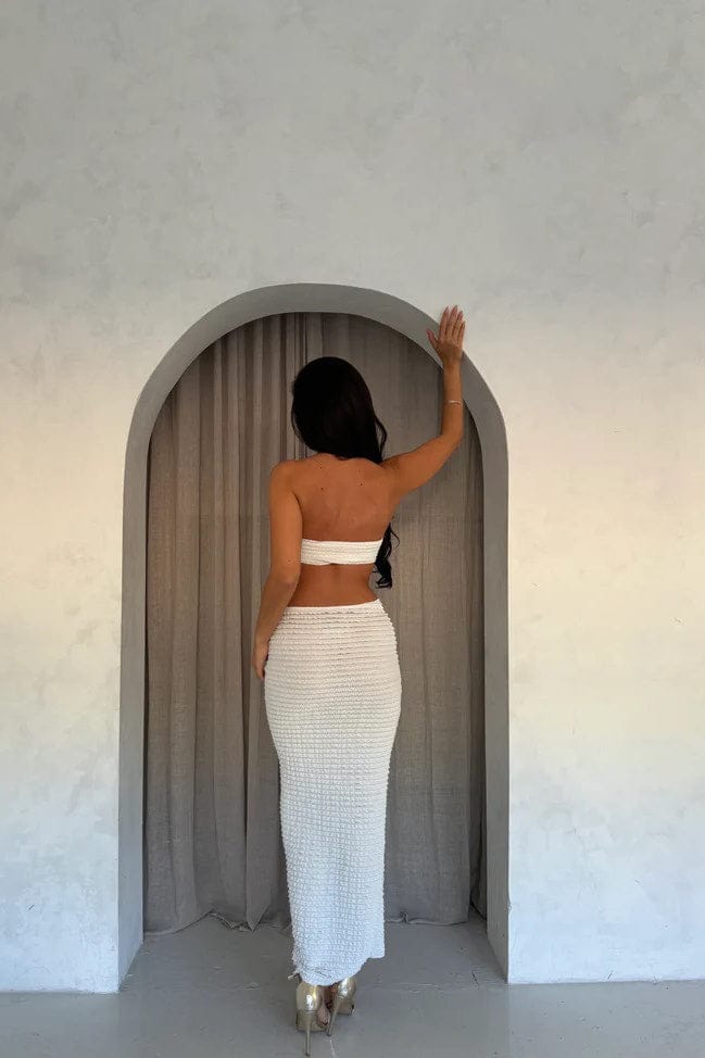 Abbraccia la raffinatezza con questo elegante coordinato bandeau bianco che combina perfettamente lo stile contemporaneo con la coordinazione senza tempo. Progettato per donne sicure di sé che apprezzano pezzi versatili e vogliono creare look straordinari con grazia naturale.